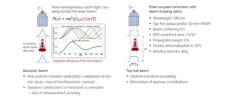 a|TopShape LD Fiber的一个具体应用是现场部署的微分量子重力测量,如欧盟资助的FIQUgS项目所示。在这个项目中,光学系统必须在整个传播范围内实现小于λ/10的RMS波前误差。该产品被用于各种原子惯性传感器的概念验证,实现了提高鲁棒性、光功率和光束传播距离等不同功能。下面参考FIQUgS项目 的结果概述了与使用高斯分布相比,平顶光束的优势。.