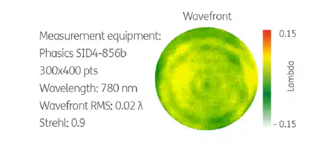 右侧的图显示了a|TopShape LD Fiber在780nm处的测量波阵面。该元件产生衍射受限的波阵面,使其与BeamTuning系列产品完全兼容。RMS波前误差为0.02λ,对应Strehl比为0.9,光学质量非常高。