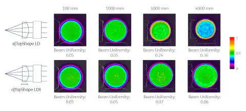 Klíčovou vlastností TopShape LD a LDX je jejich dlouhá a stabilní vzdálenost šíření. Následující obrázek ukazuje rozložení intenzity při pracovních vzdálenostech 100 mm, 1000 mm, 3000 mm a 4000 mm. Obě se vyznačují rovnoměrností svazku 0,05 až do 1500 mm. Změnou průměru vstupního svazku lze u zařízení TopShape LDX zaručit rovnoměrnost svazku 0,06 až do 3200 mm.