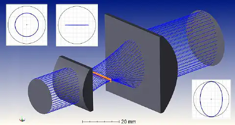 Cylindrical lenses allow the creation of a line focus. By combining with a second acylinder an elliptical beam is generated. The stretching ratio is determined by the focal lengths of the two elements. The system shown on the right represents a cylinder telescope.