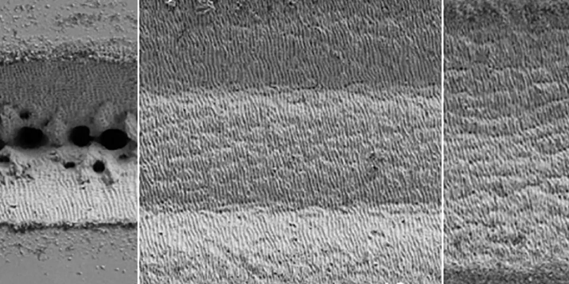 Abbildungen a - c zeigen die mit verschiedenen Strahlprofilen durchgeführten Zeilenscans. Im Vergleich zum (inhomogenen) Gaußprofil (Abb. a/d) weisen die mit dem a|AiryShape erzeugten Strahlprofile (b/e: Donut; c/f: Top-Hat) einen sehr homogenen Abtrag auf. Der Beam Shaper eignet sich für die Arbeit mit einem Scanner und einer F-Theta-Linse, wie sie in der Materialbearbeitung üblich sind. Folgende SEM-Aufnahmen (= rasterelektronenmikroskopische Aufnahme, nach engl. Bezeichnung „scanning electron micrograph“) zeigen die Ergebnisse einzelner Spots auf Edelstahl in Abhängigkeit des Femtosekunden-Laserpulses (N=200). Donut und Top-Hat weisen aufgrund der Verteilung der Pulsenergie auf eine größere Fläche geringere Ablationstiefen auf (Bereich 5-10 µm). Dies ermöglicht z.B. einen gleichmäßigeren Materialabtrag.